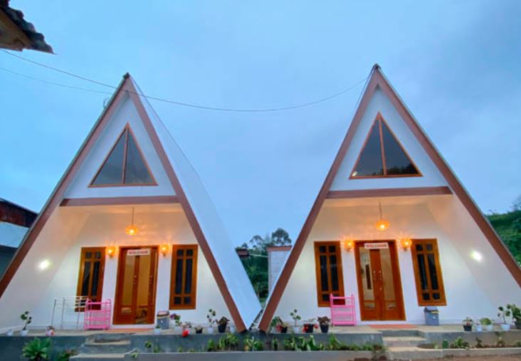 Dengan desain minimalis dan bentuk segitiga yang unik, Villa Segitiga Dieng cocok untuk keluarga hingga enam orang. Lokasinya sangat strategis, dekat dengan beberapa objek wisata terkenal seperti Komplek Candi Arjuna, Kawah Sikidang, dan Telaga Warna. Alamatnya di Karangsari, Dieng Kulon, Batur, Banjarnegara. Harga menginap per malam mulai dari Rp 750 ribu.